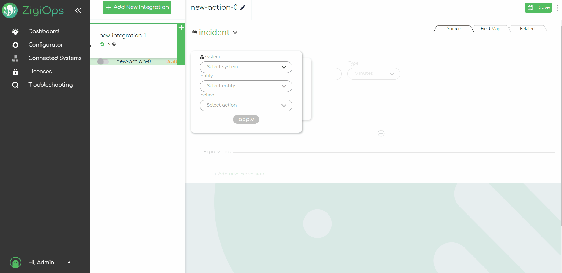The Integrated Systems section selects which 2 systems we want to integrate. The first system we need to select is the target system and the entity and action type we need, which is Create in this example. Next, we need to select the target system and the target entity. Placing the mouse cursor on any fields will automatically bring a list of the existing connected systems, which you could integrate.