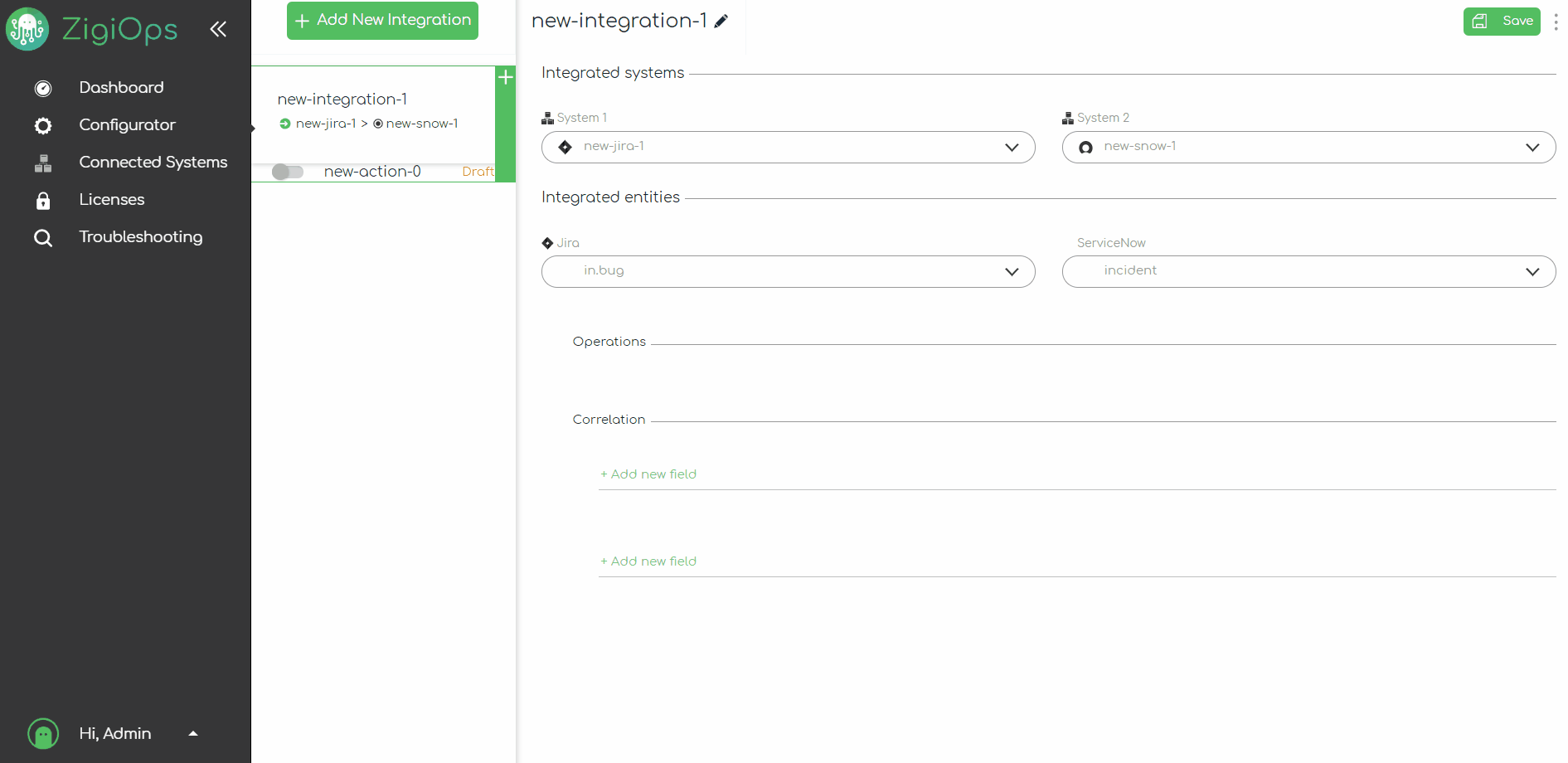 Our previous operation is taking care of transferring the newly created records from Jira to ServiceNow. Let’s configure our second operation, which will synchronize the changes made to the Jira records to the ServiceNow records. To create a new blank operation, we can click on the Plus button of the integration itself. A new draft operation will be added automatically at the bottom of our list of operations. Since this operation will update our ServiceNow incidents, we should set its type to Update from the top menu bar; this way, we are instructing ZigiOps to use the correlation information to synchronize the entities.