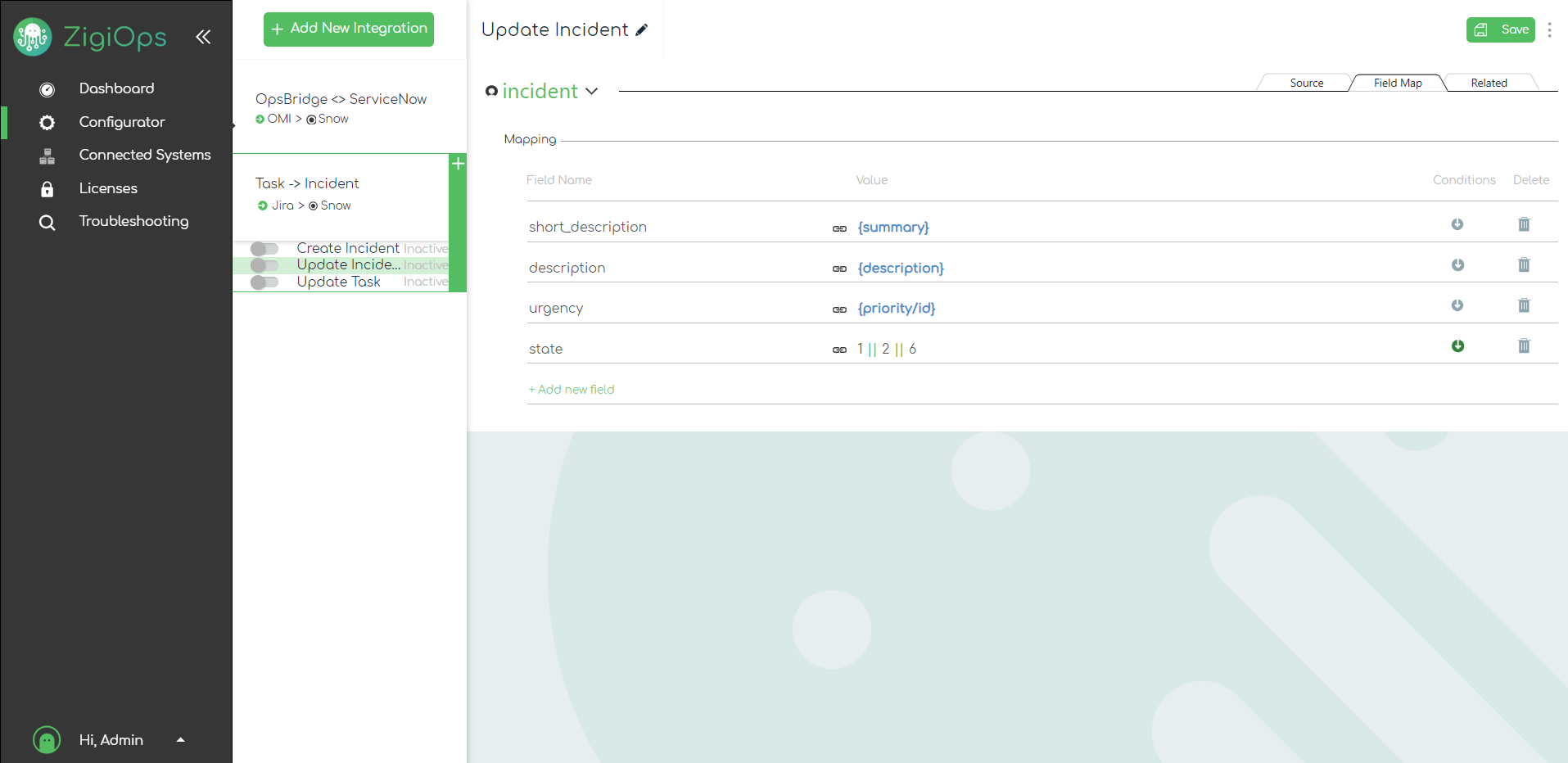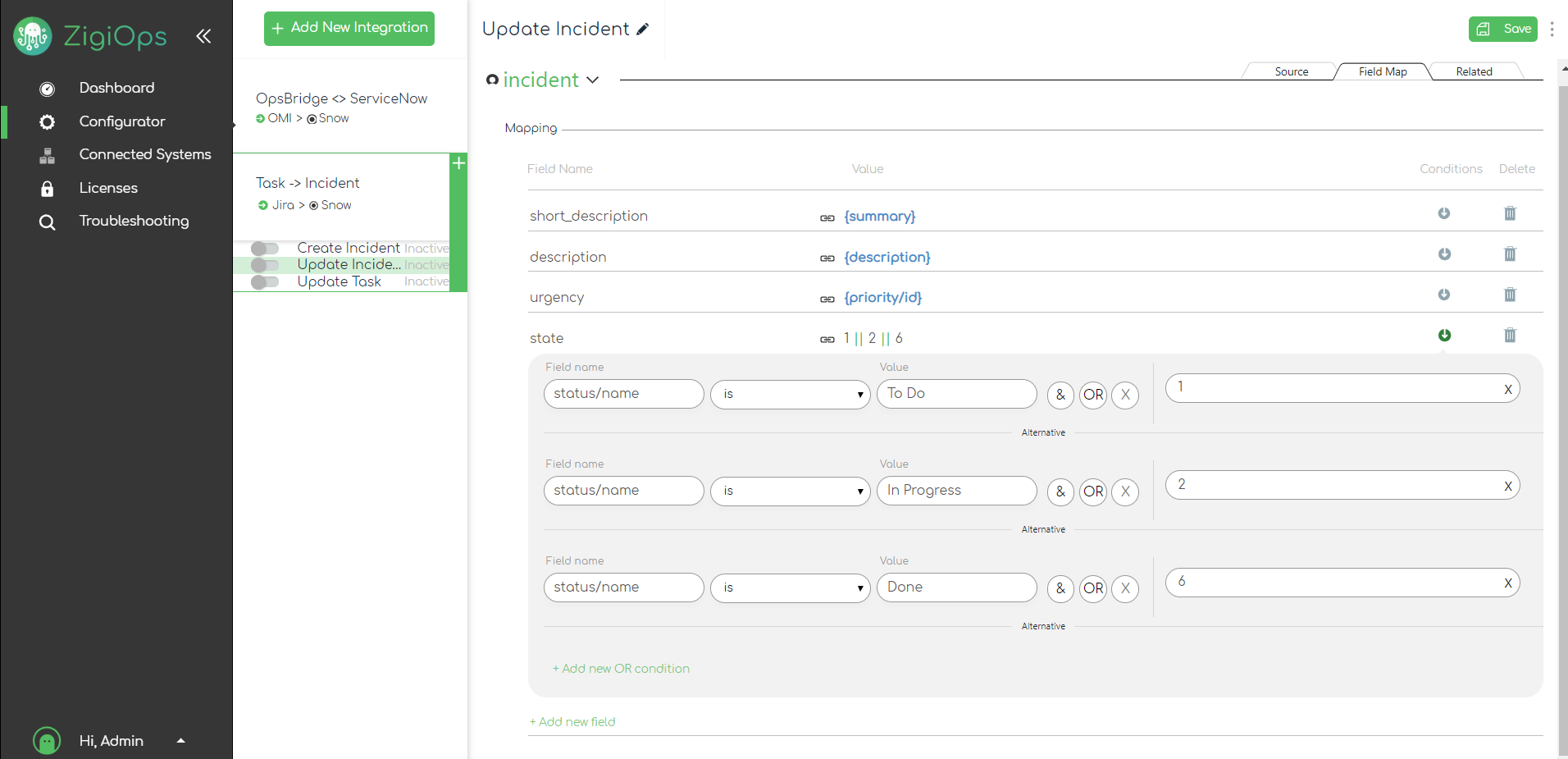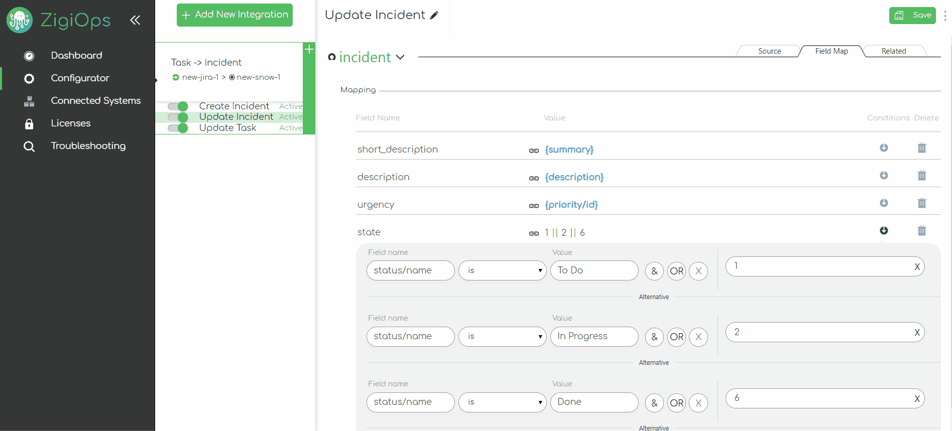 With the configuration above, we're instructing ZigiOps to perform the following mapping, based on our conditions: