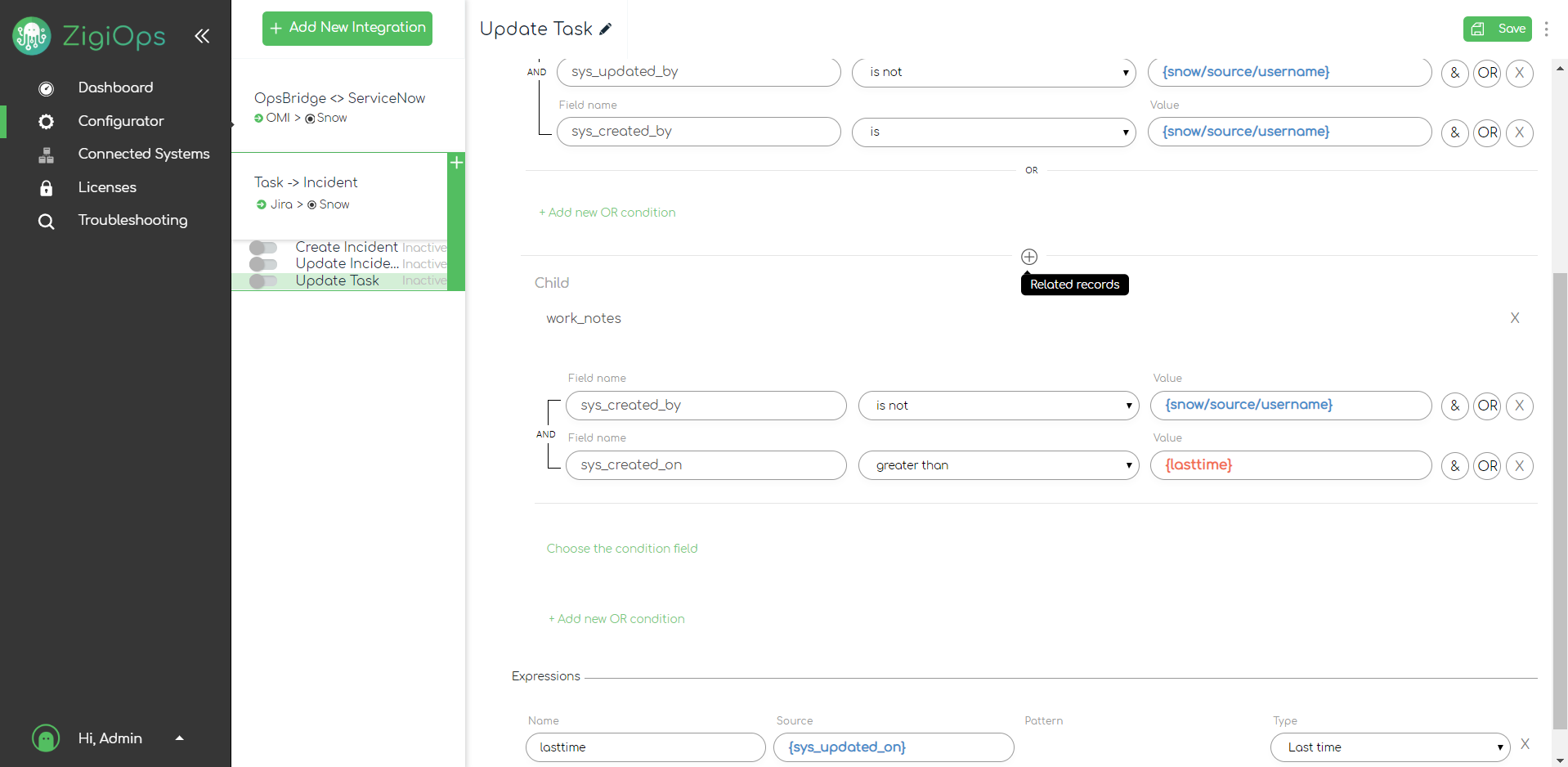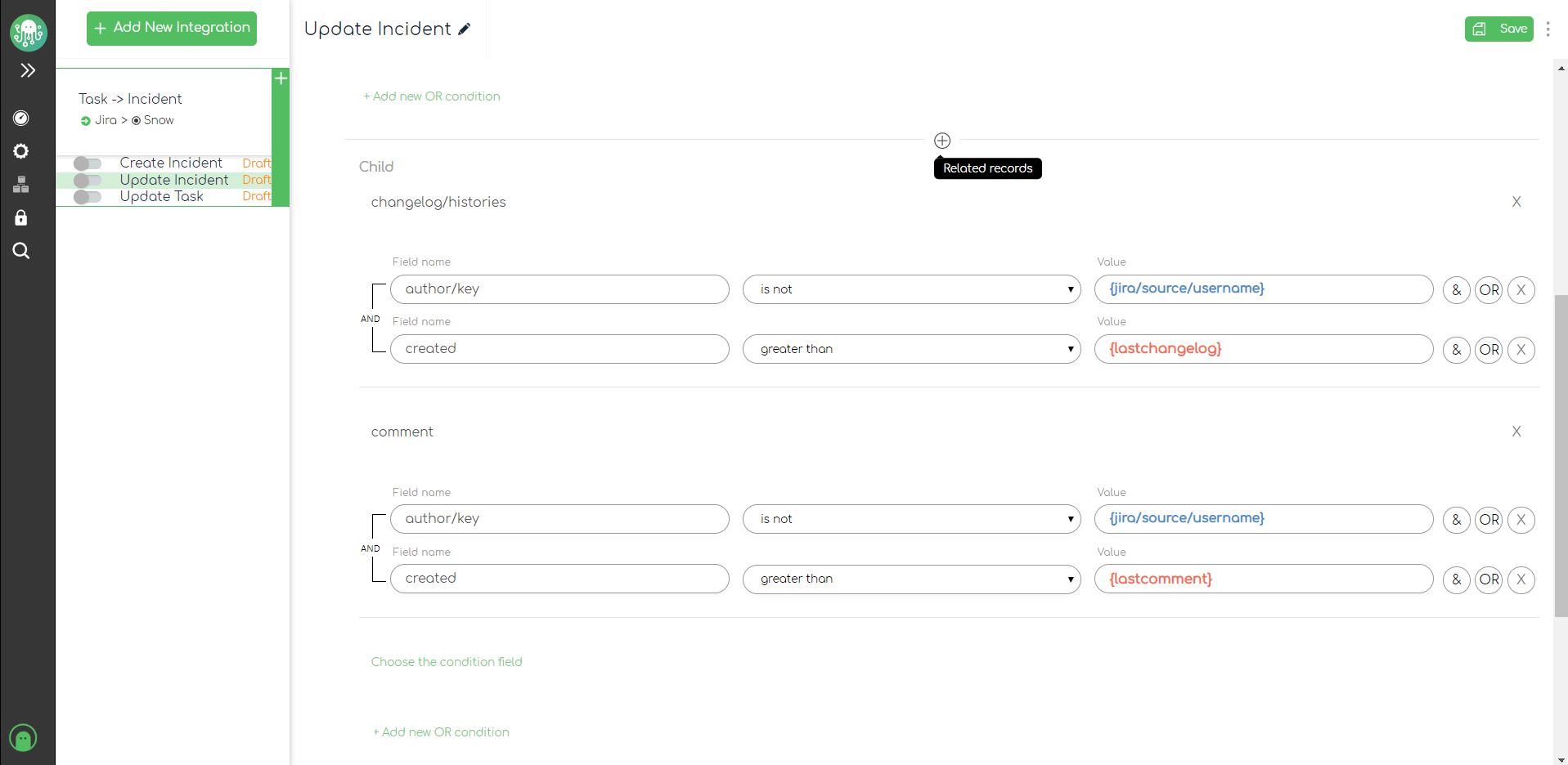 We also need to configure conditions for the work notes in our ServiceNow incidents. Since work_notes is a nested field, we need to expand the Related Records section and place our conditions there: