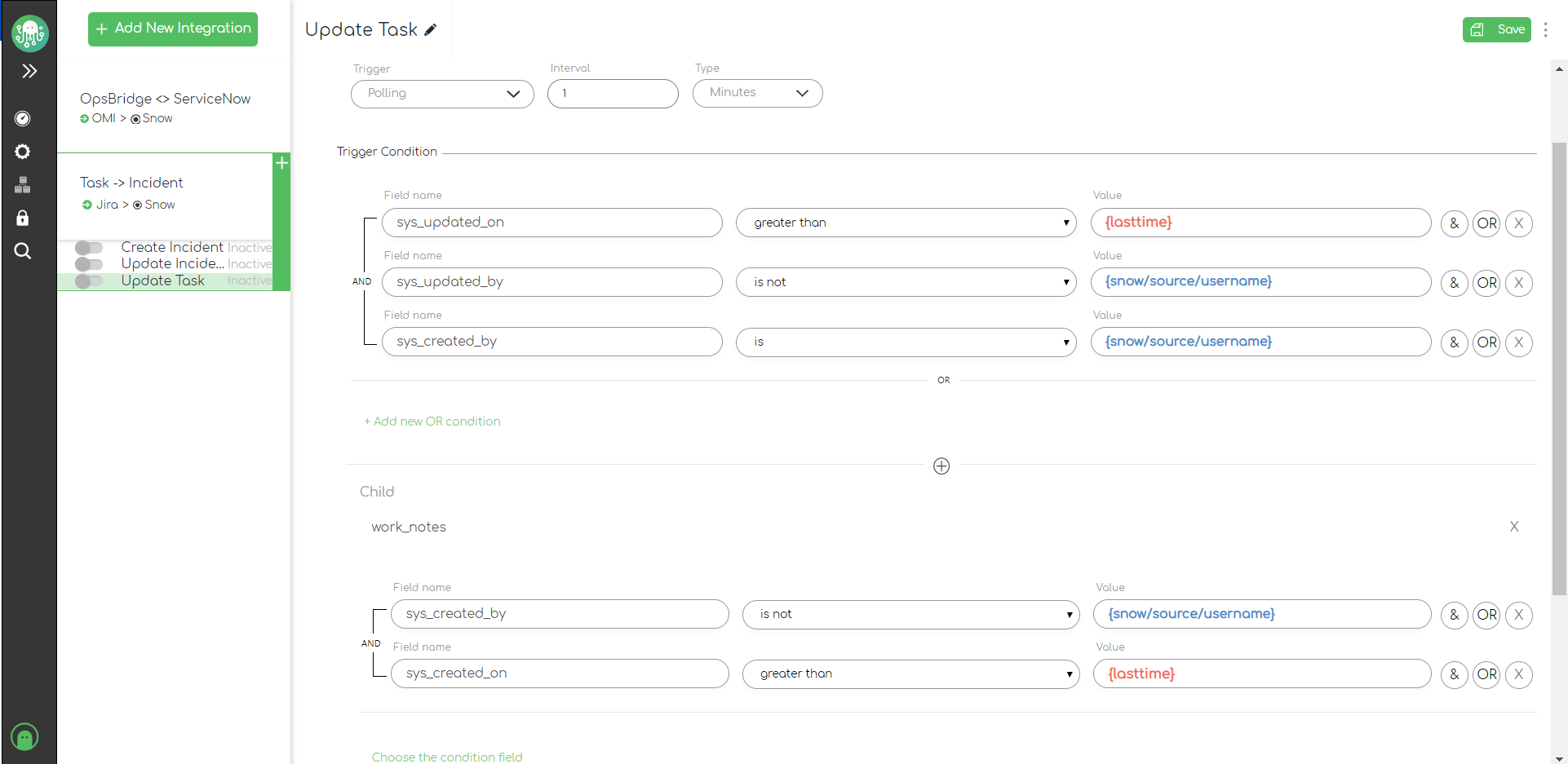 For ZigiOps to update our Jira tasks with changes from their correlated incidents in ServiceNow, we'll set the following trigger conditions:
