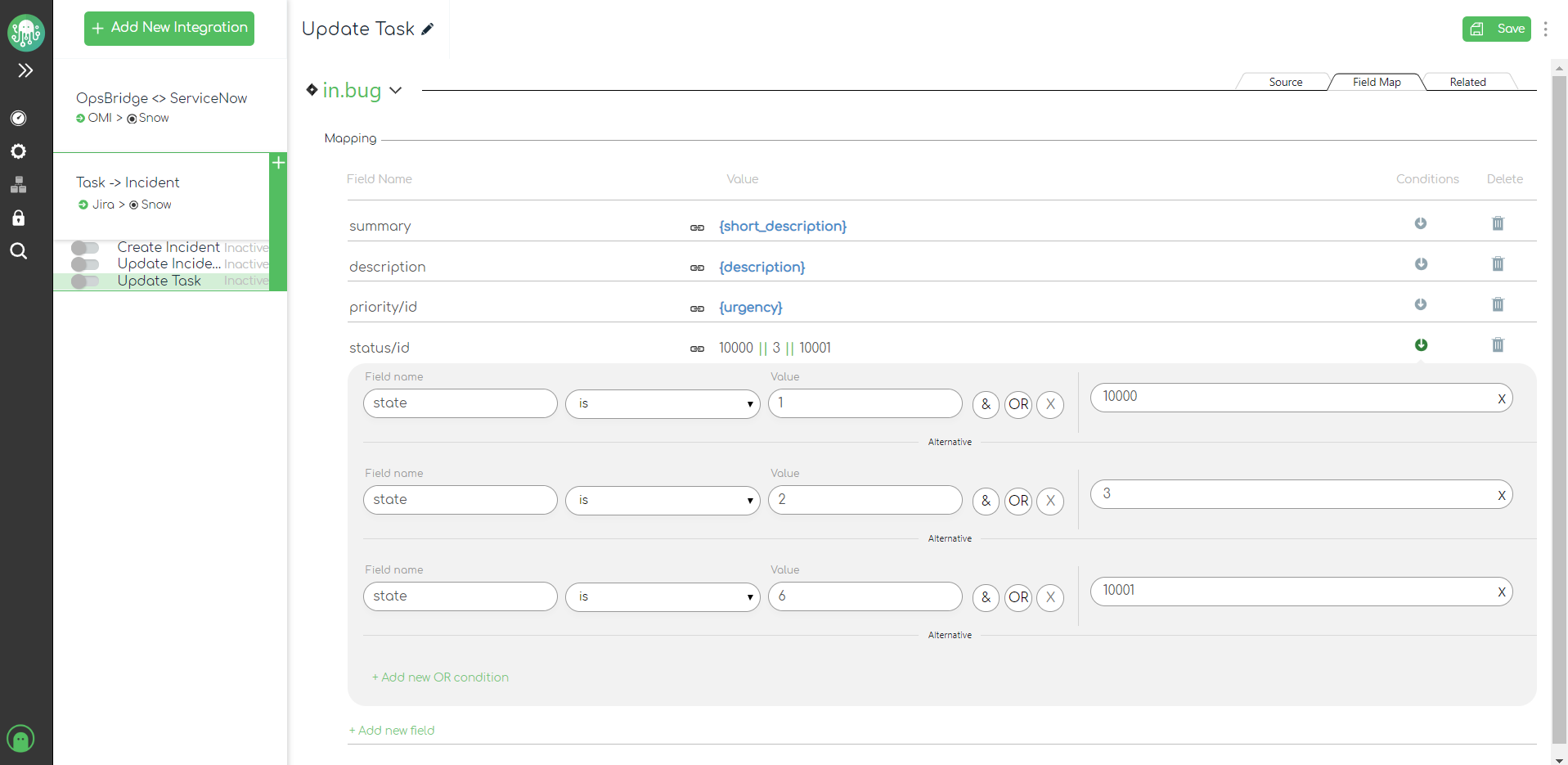 Once we go to the mapping, we will set several conditions for the state field in Jira. These conditions are responsible for the proper adjustment of the status field in ServiceNow.