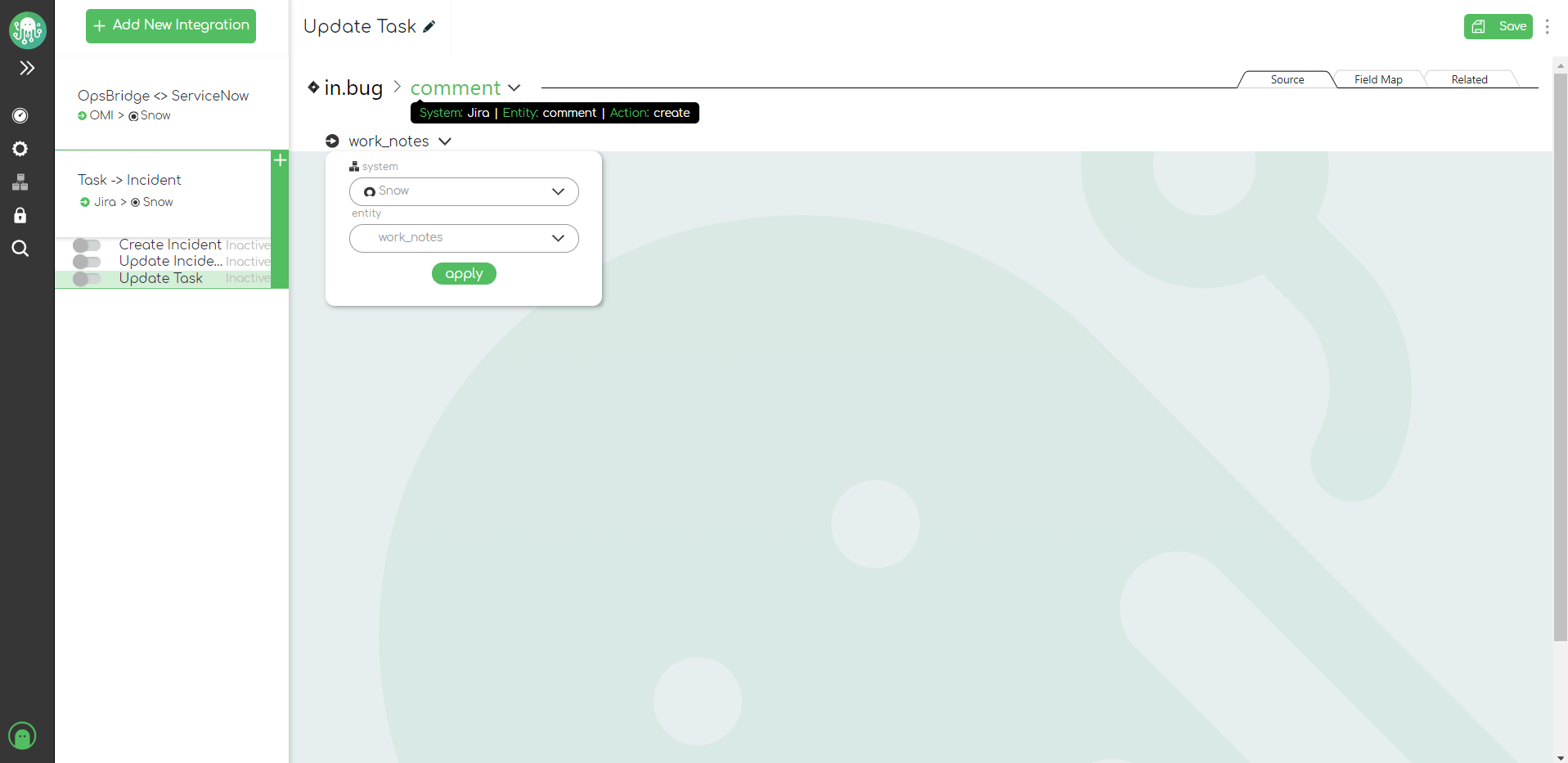 Finally, our third operation will be responsible for transferring updates from our ServiceNow incidents back to their correlated tasks in Jira. This means we need to set the integration direction in the top menu bar to point back to the Jira tasks.