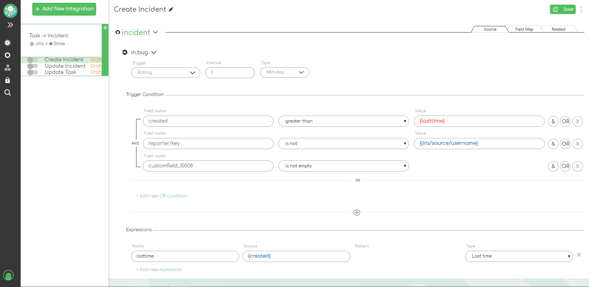 Please note that if we don't create a Last Time expression, ZigiOps will continuously collect previously collected data from the source system, whether it was already created in the target system or not, causing data duplication!