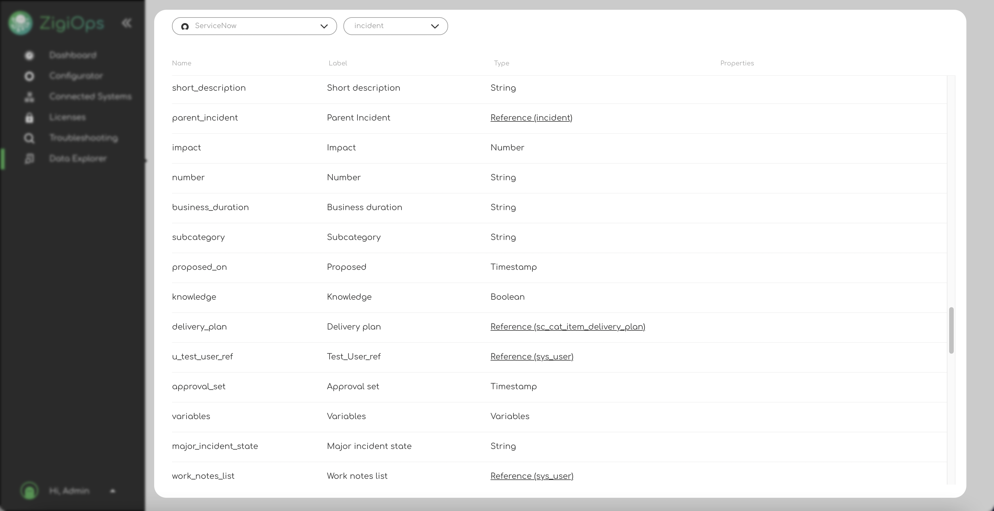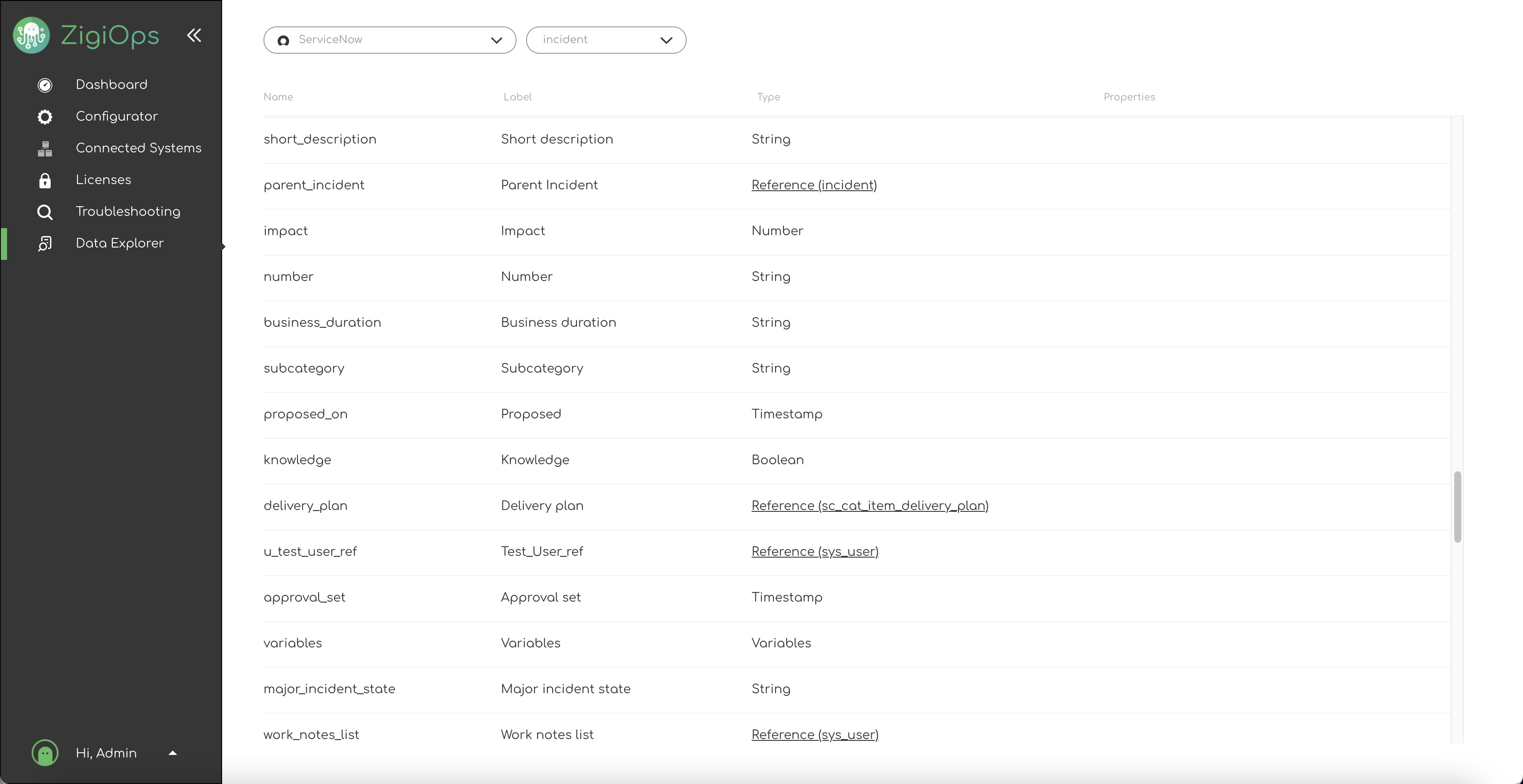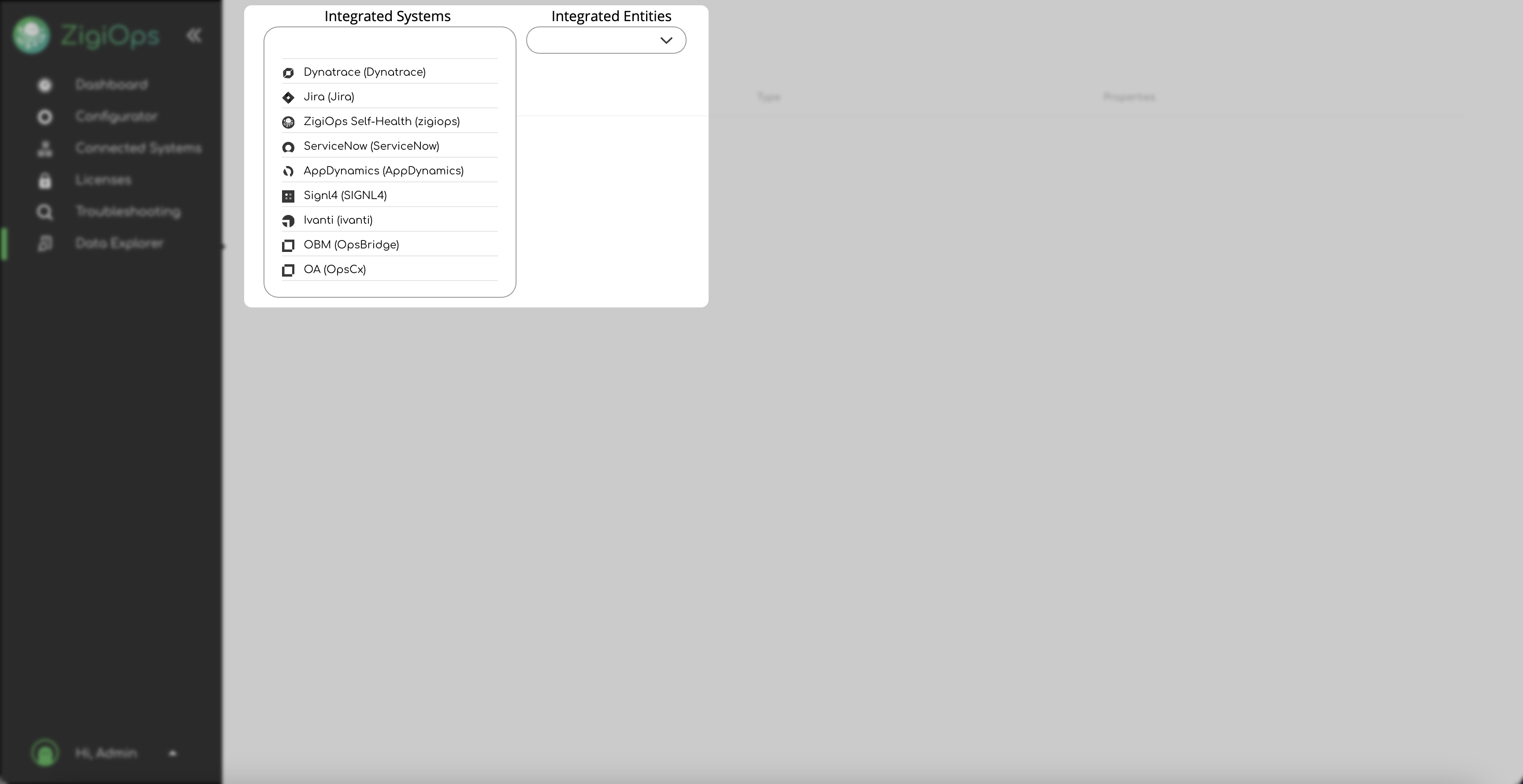 The Data Explorer is available in the main ZigiOps menu and allows exploring the metadata available for the existing connected systems in your ZigiOps instance.