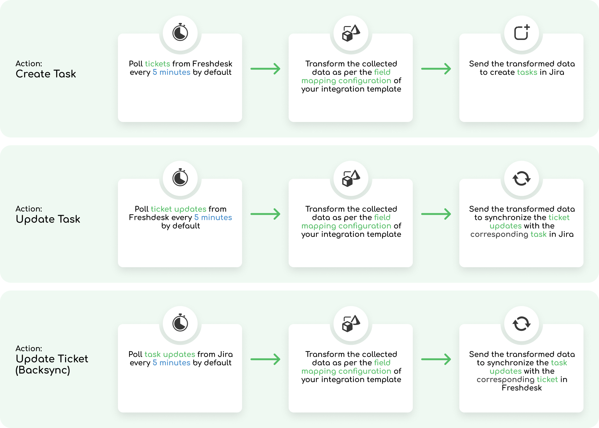 ZigiOps automatically collects Freshdesk’s tickets on pre-defined time intervals and transfers them to Jira as a new task. All necessary fields will be transformed and also moved to Jira (based on the defined mapping in ZigiOps).