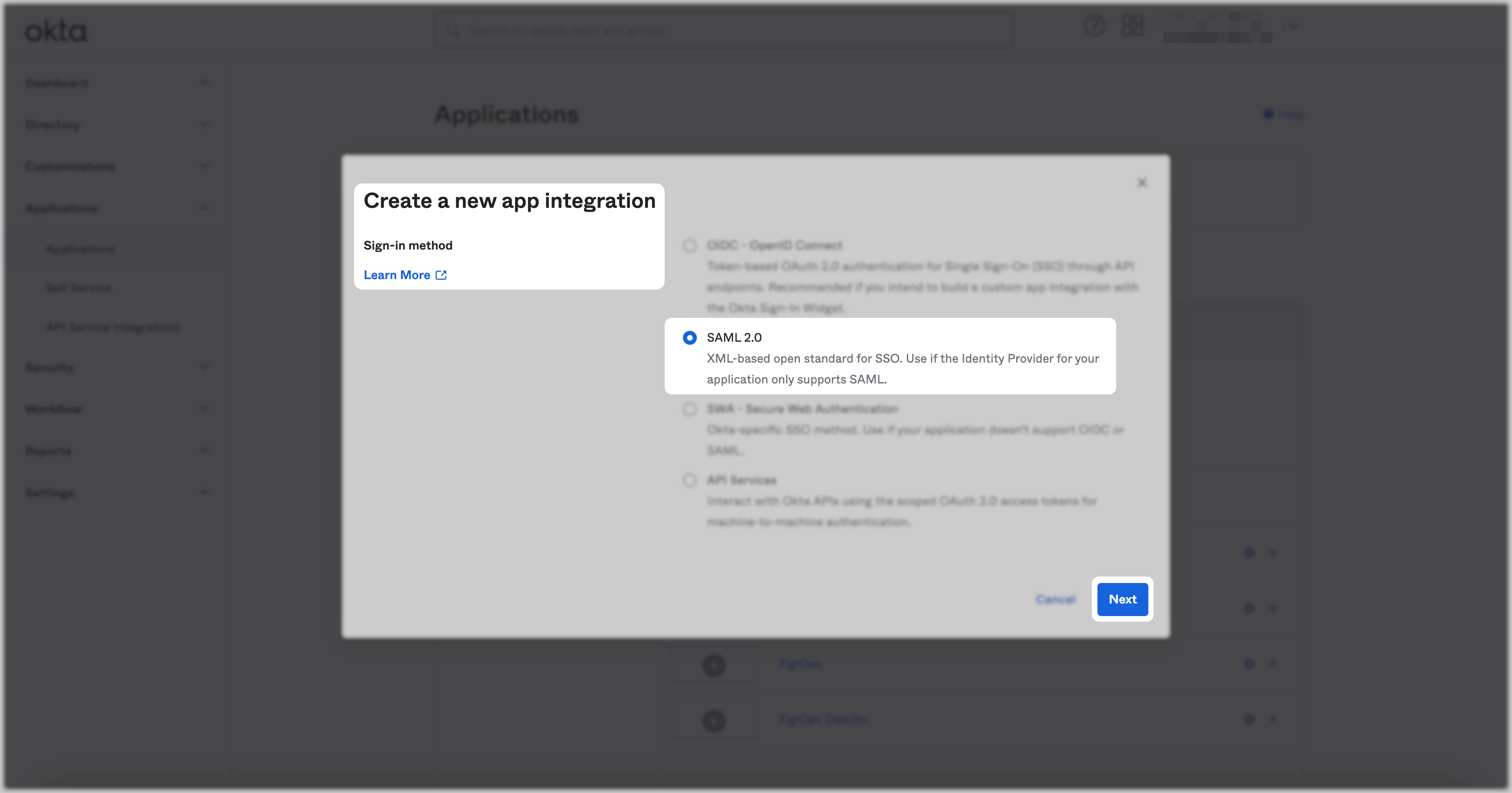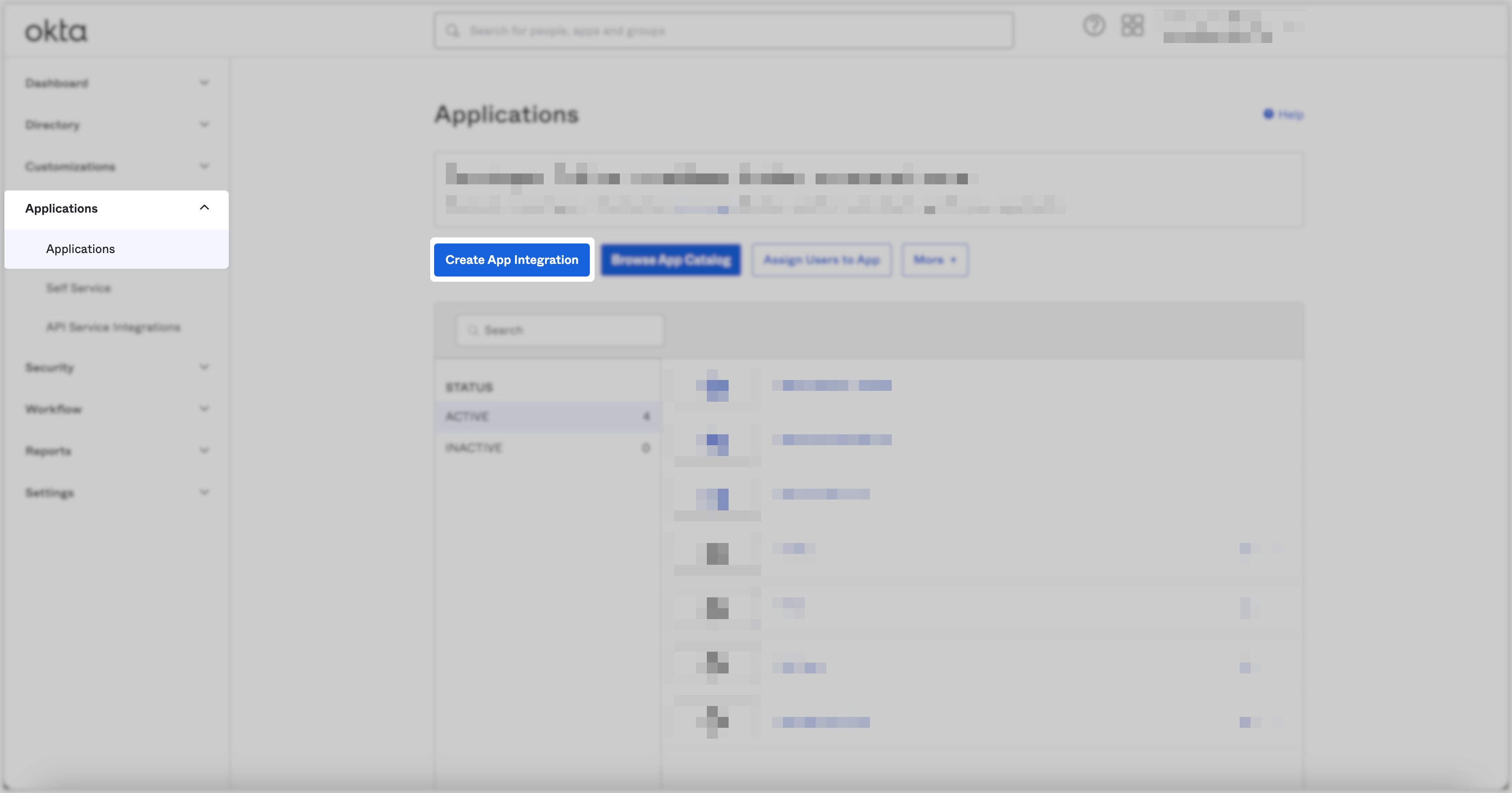 Log in to your OKTA UI instance, navigate to the Applications → Applications menu, and click the Create App Integration button.
