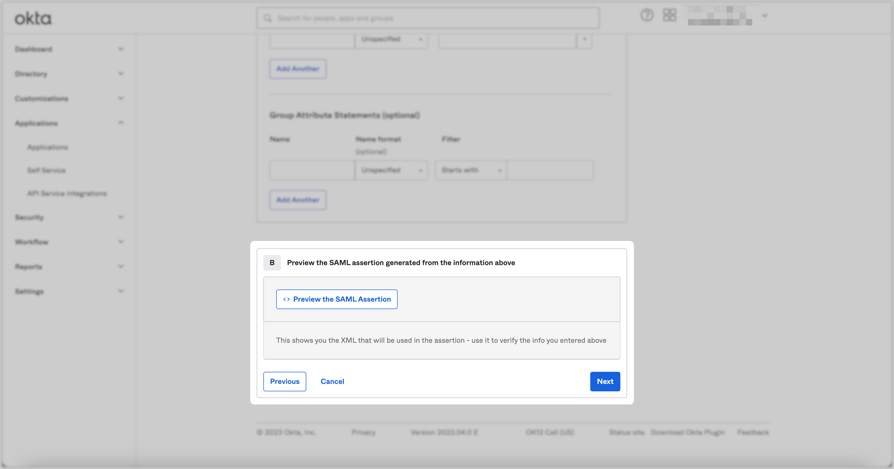 Scroll down and click the Preview the SAML Assertion button, which becomes available after a user is assigned to the application.