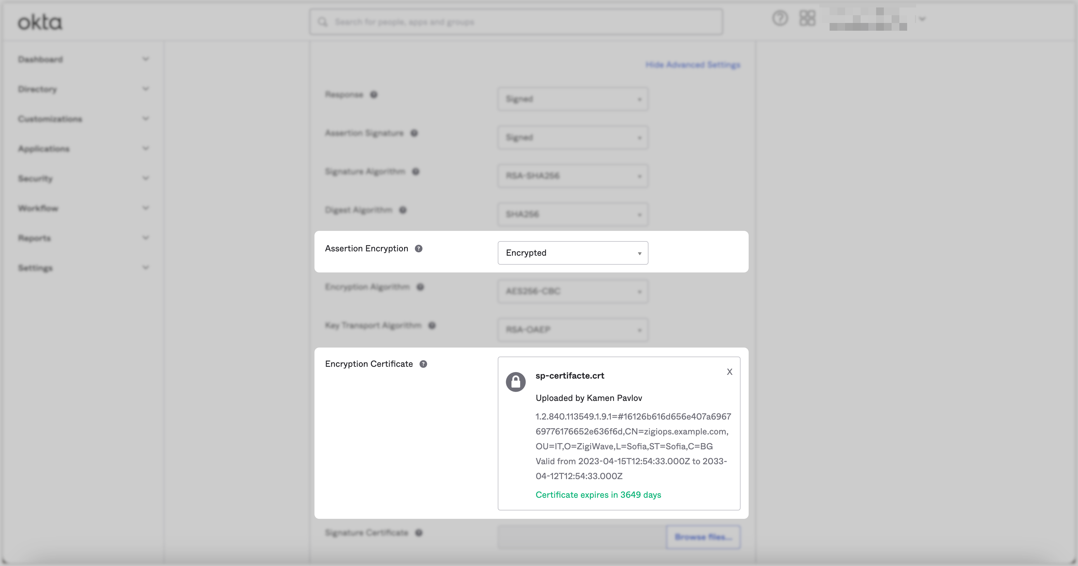 Certificate - Upload the OKTA certificate you downloaded earlier.