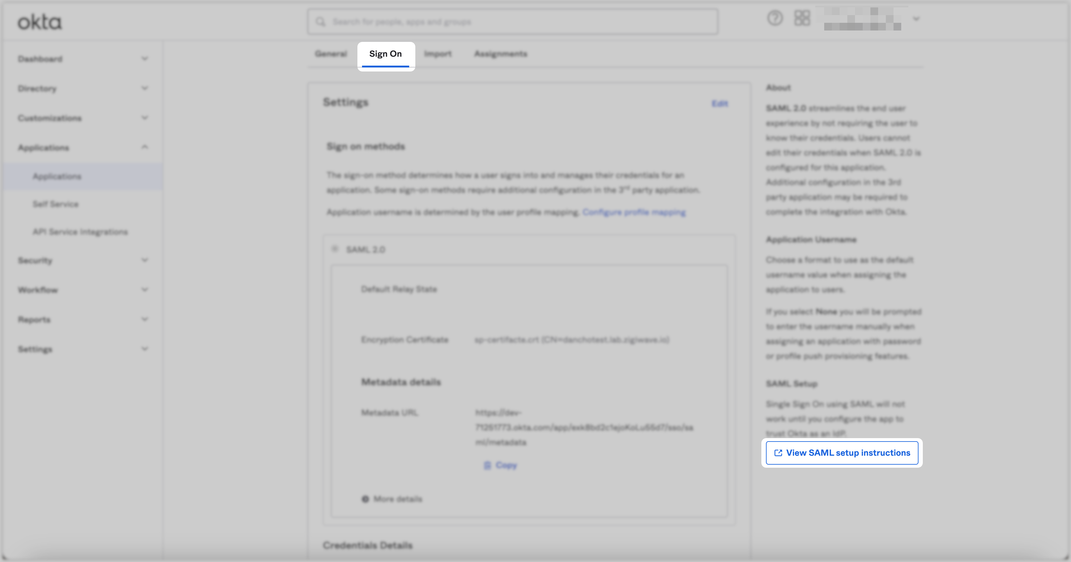 Open the newly created application, navigate to the Sign On tab, and click the View SAML Setup Instructions button.