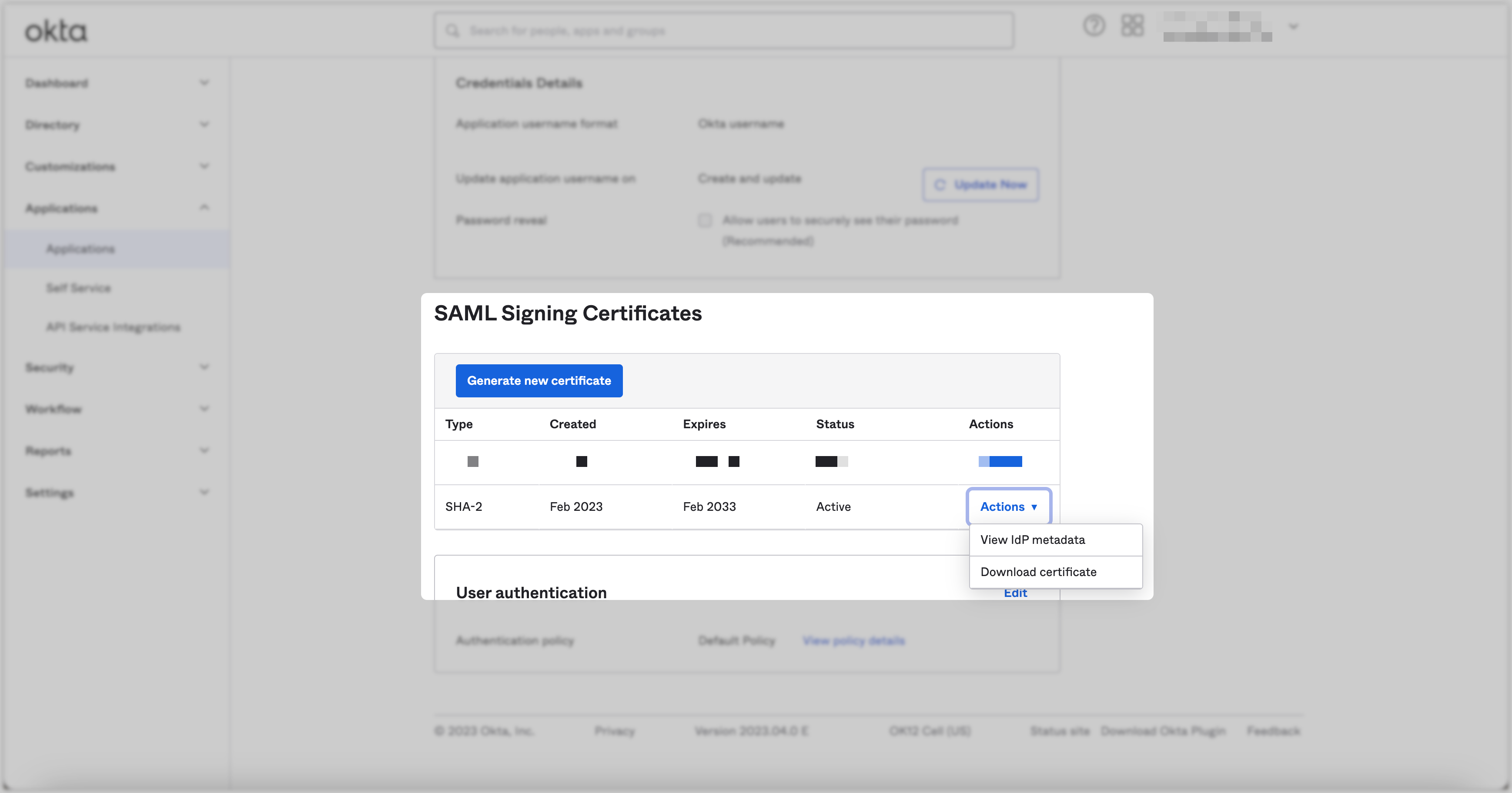 Go back to the Sign On tab and scroll down to the SAML Signing Certificates section; click the Actions → Download Certificate button to download the certificate, which should be uploaded to ZigiOps later.