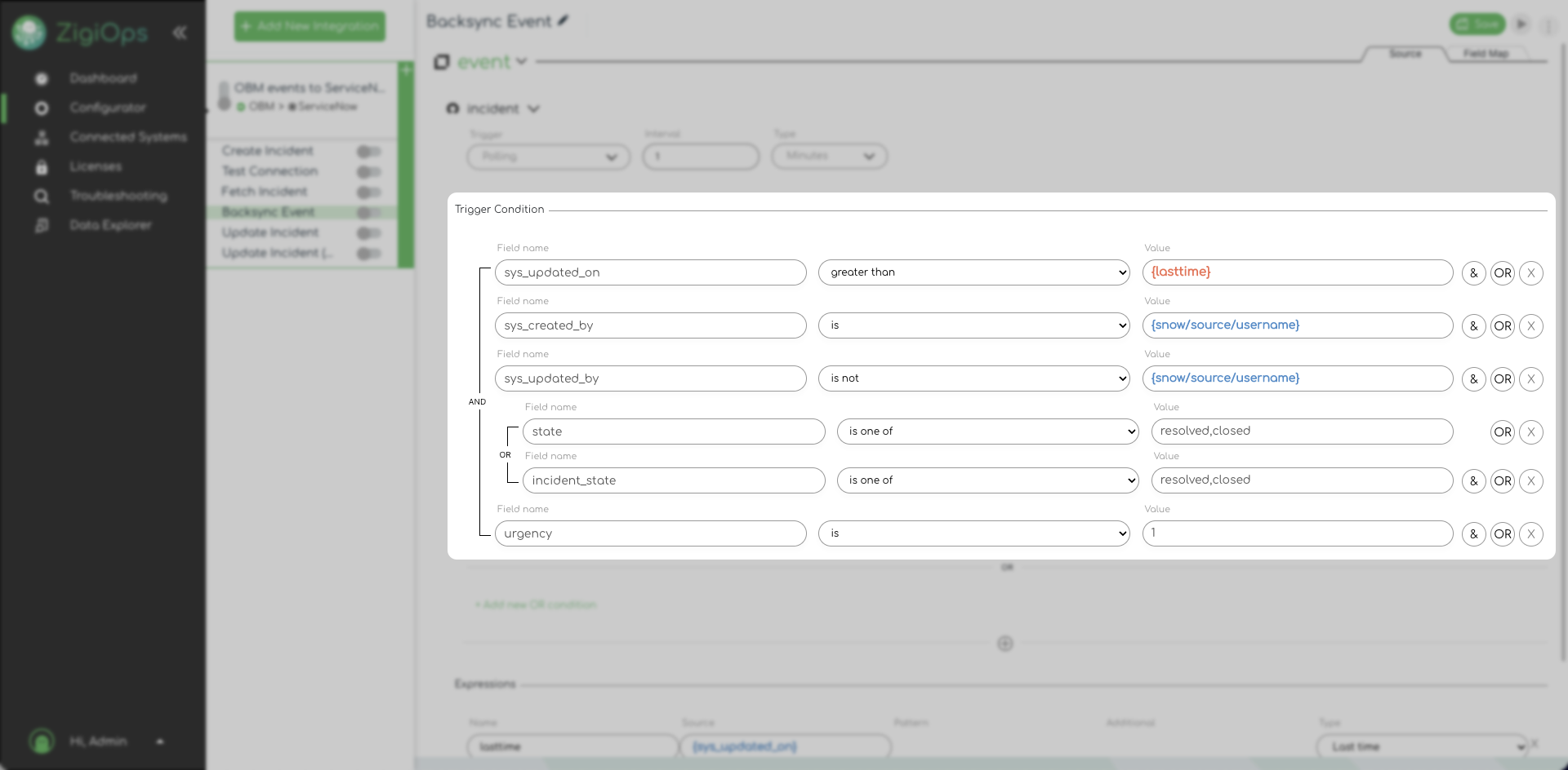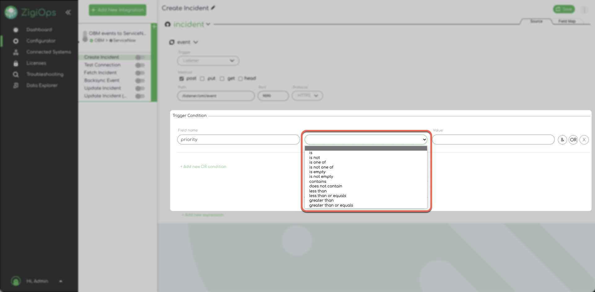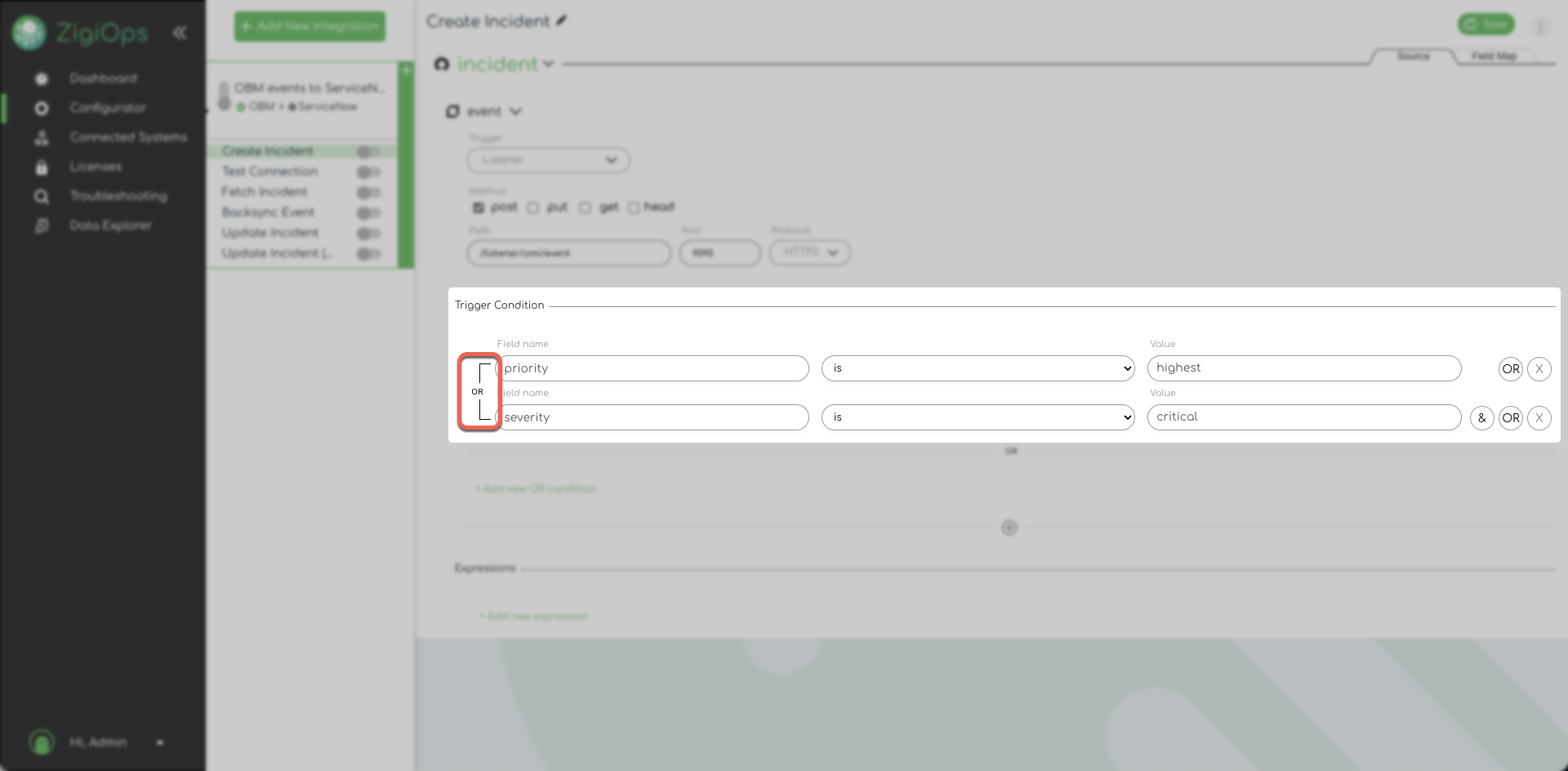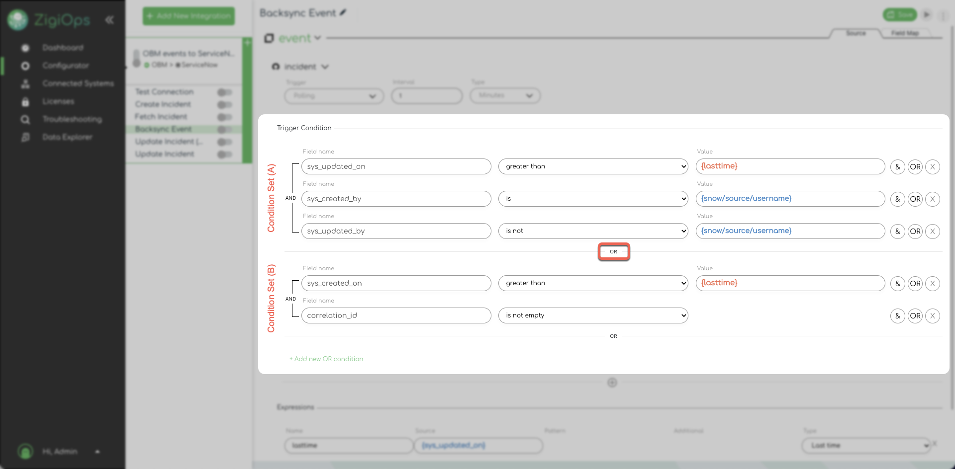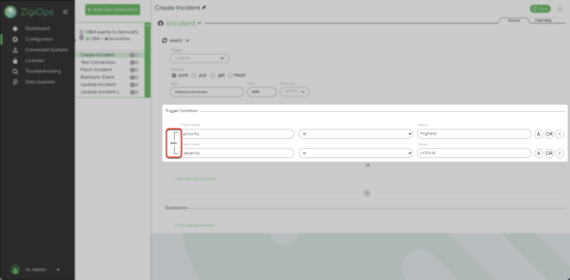 The ZigiOps supports building complex conditions with logical operators, as shown below.