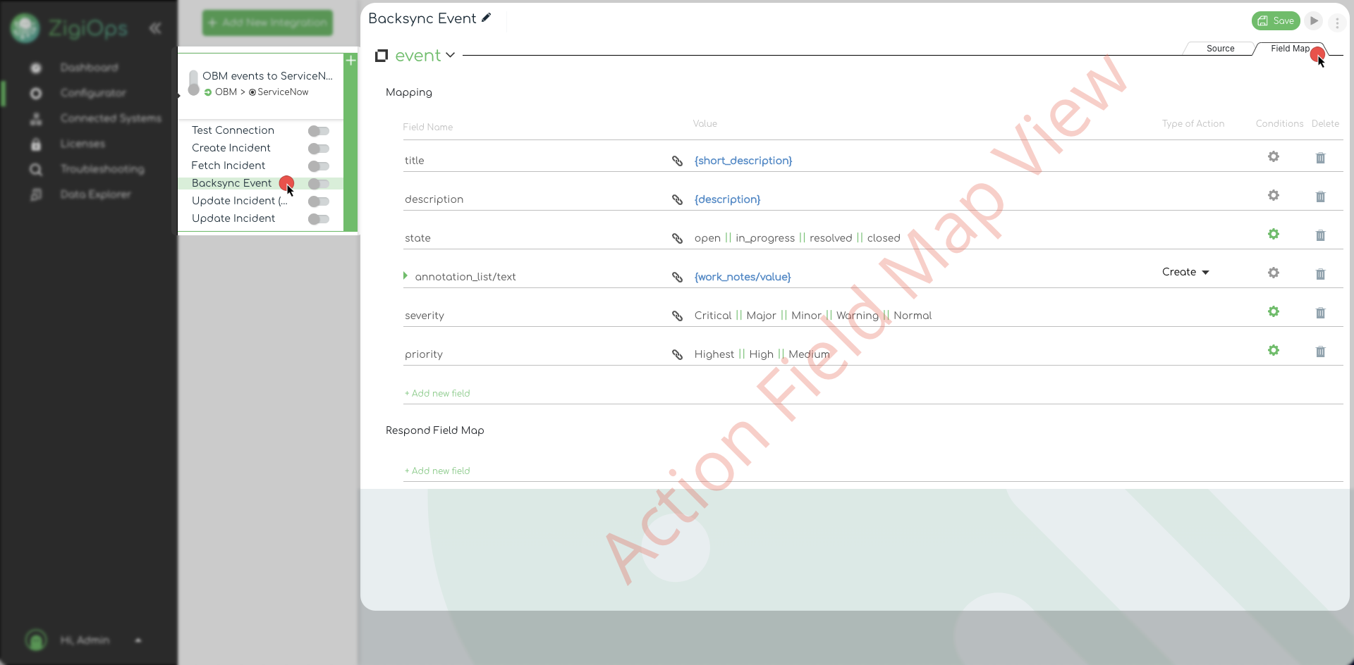 Clicking an action displays the Action Source Tab on the right side of the screen by default. Clicking the Field Map button at the screen's upper-right displays the Action Field Map Tab. You may switch between the Action Source Tab and the Action Field Map Tab from the upper-right part of the screen by clicking on the corresponding button.