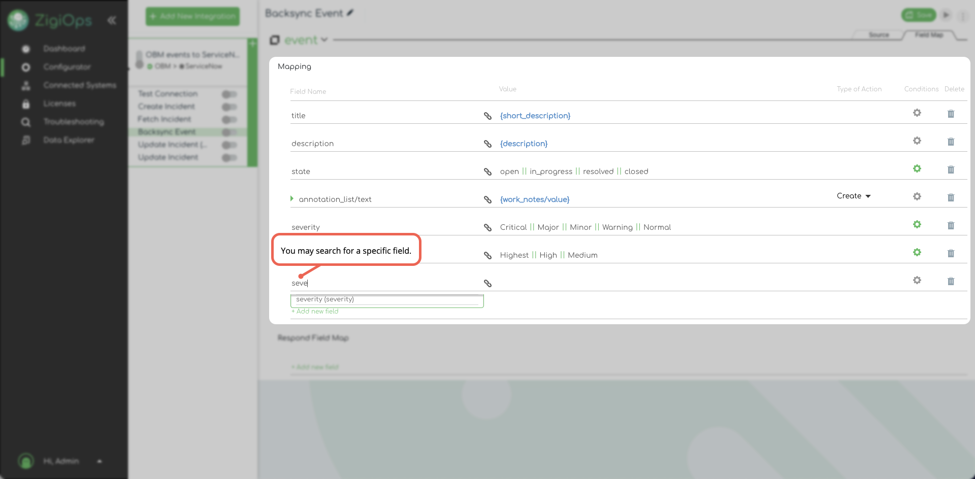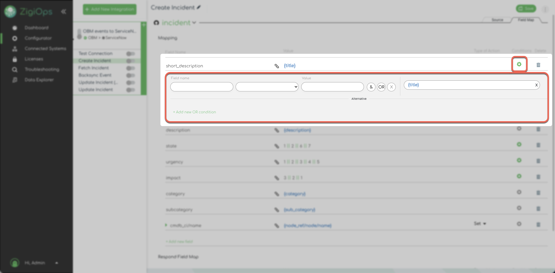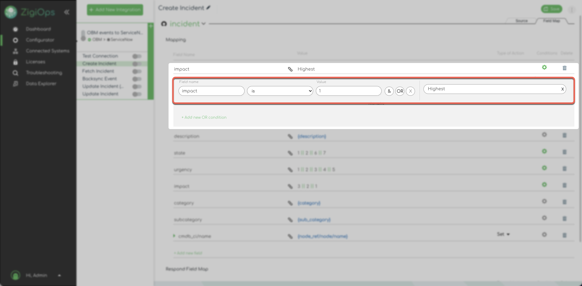 The field map configuration also supports adding alternative conditions. The conditions are evaluated from top to bottom. Hence, the first condition met will report the configured value and not evaluate the rest of the conditions. ZigiOps will continue checking the next available condition if a condition is not met. If none of the conditions are met, ZigiOps will discard the field.