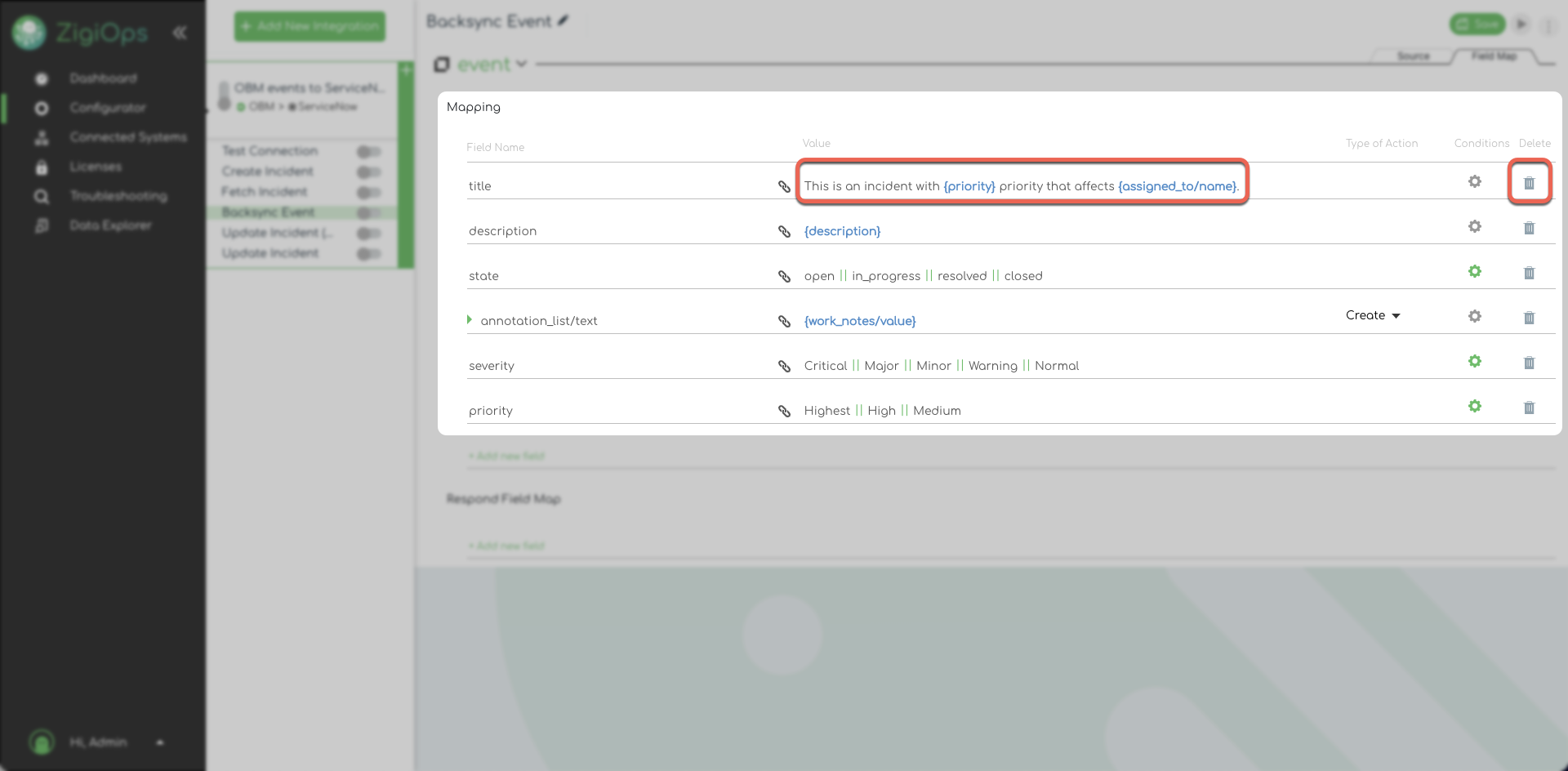The mapping configuration is not limited to sending only the value of a single attribute, but it also supports mapping multiple attributes and possibly combining attribute(s) with static text. For example, you could add additional source attribute(s) and some static text, as shown below. ZigiOps will send the value as a whole in such a case, and the result will be "This is an incident with high priority that affects John Doe". Clicking the Recycle Bin button deletes an entry from the mapping.