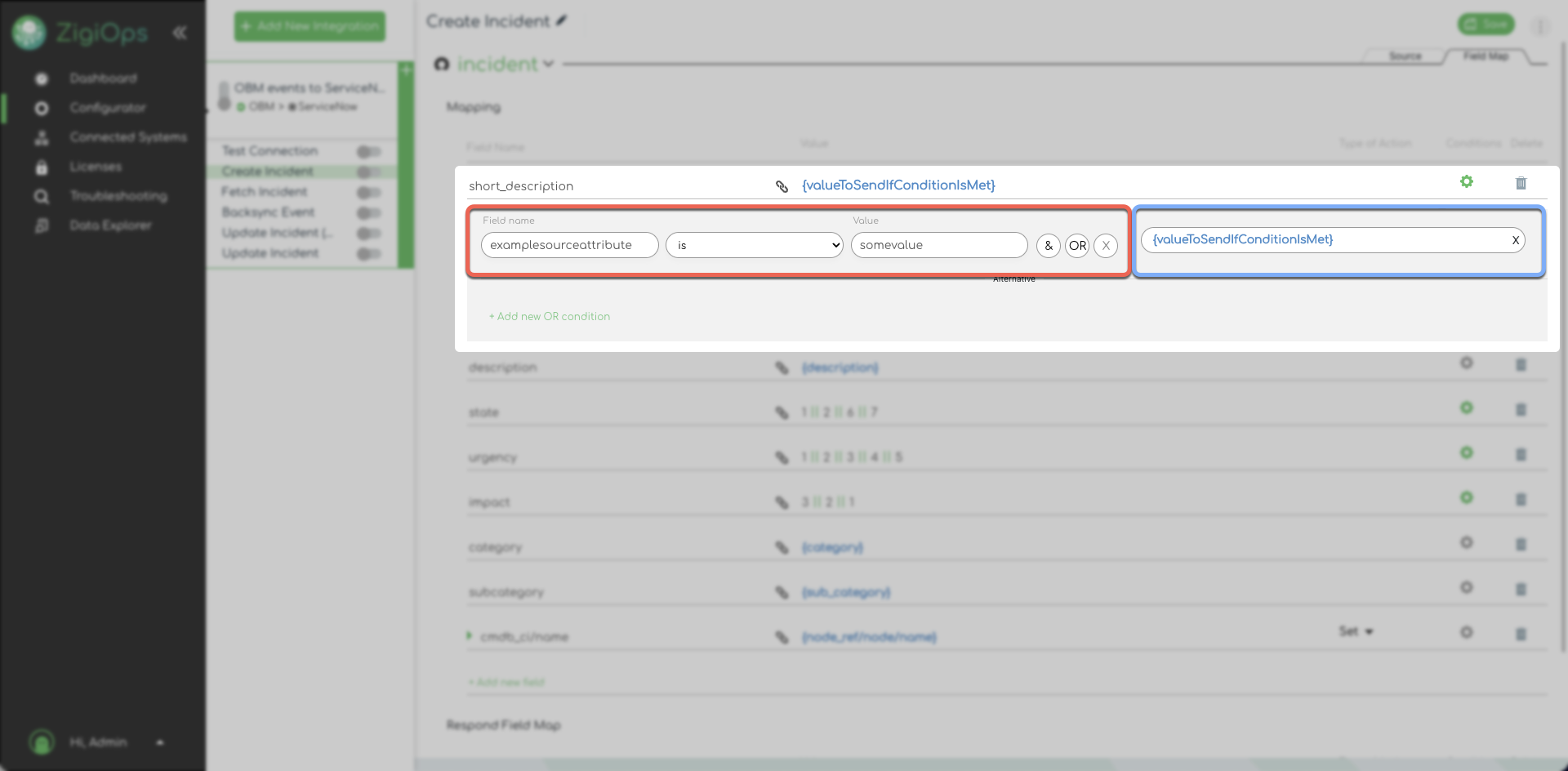 The field map configuration supports using conditions (or conditional mappings). The conditions are based on source system fields. Adding a condition to a mapped field requires that the source record meets for the ZigiOps to process the configured mapping. If none of the conditions are met, ZigiOps will discard the field.