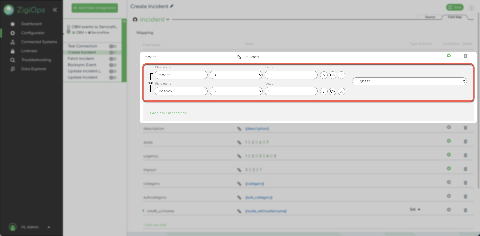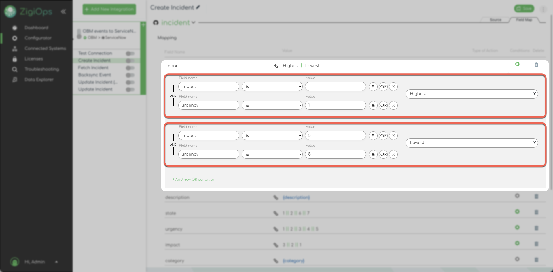In the example below, if the impact attribute of the source system is "1" AND the urgency attribute of the source system is "1." The integration will send "Highest" for the priority attribute of the target system. If the impact or the urgency isn't equal to "1", the ZigiOps will continue checking the next alternative condition. Suppose the impact attribute of the source system is "2" AND the urgency attribute of the source system is "2". In that case, The integration will send "High" for the priority attribute of the target system.