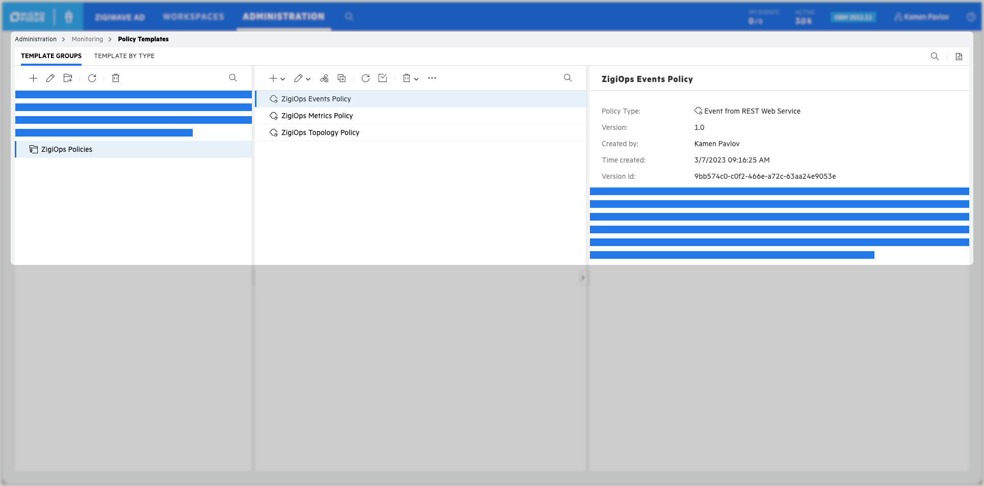 Go to Administration → Monitoring → Policy Templates, select the ZigiOps Policies template group, choose one of the policies and click the Assign & Deploy button.