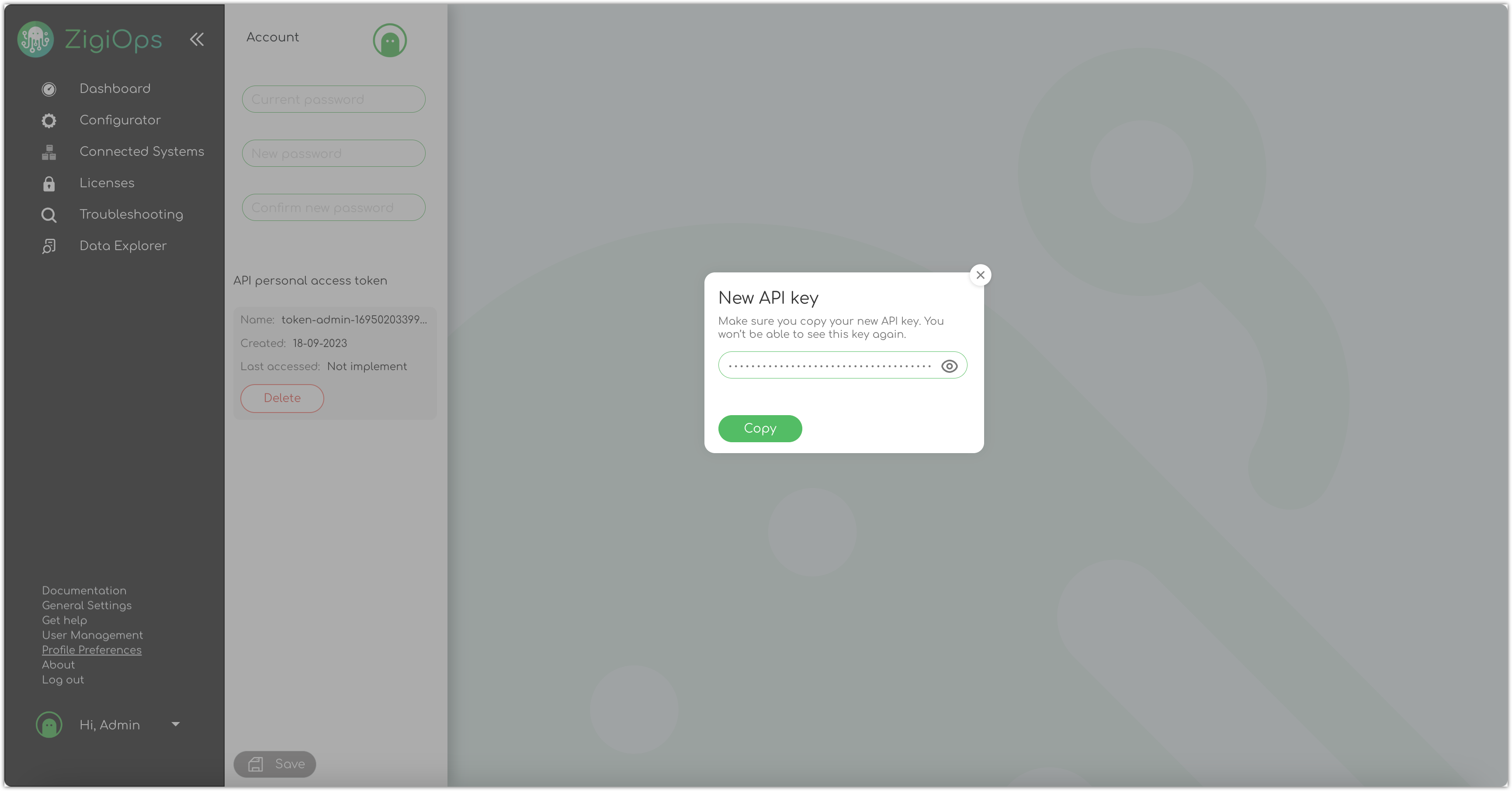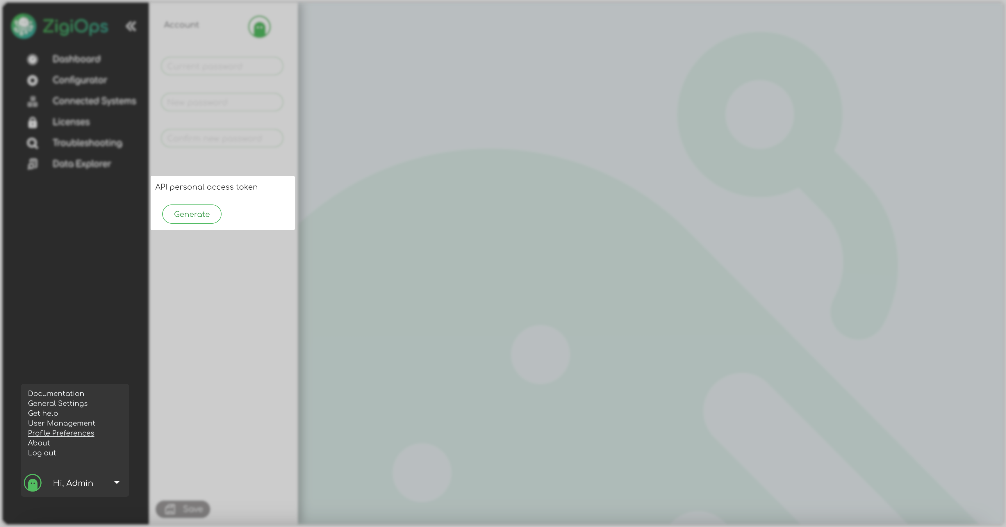 Log in to the ZigiOps UI, navigate to the Admin → Profile Preferences menu, and click the Generate button to create your API Personal Access Token.