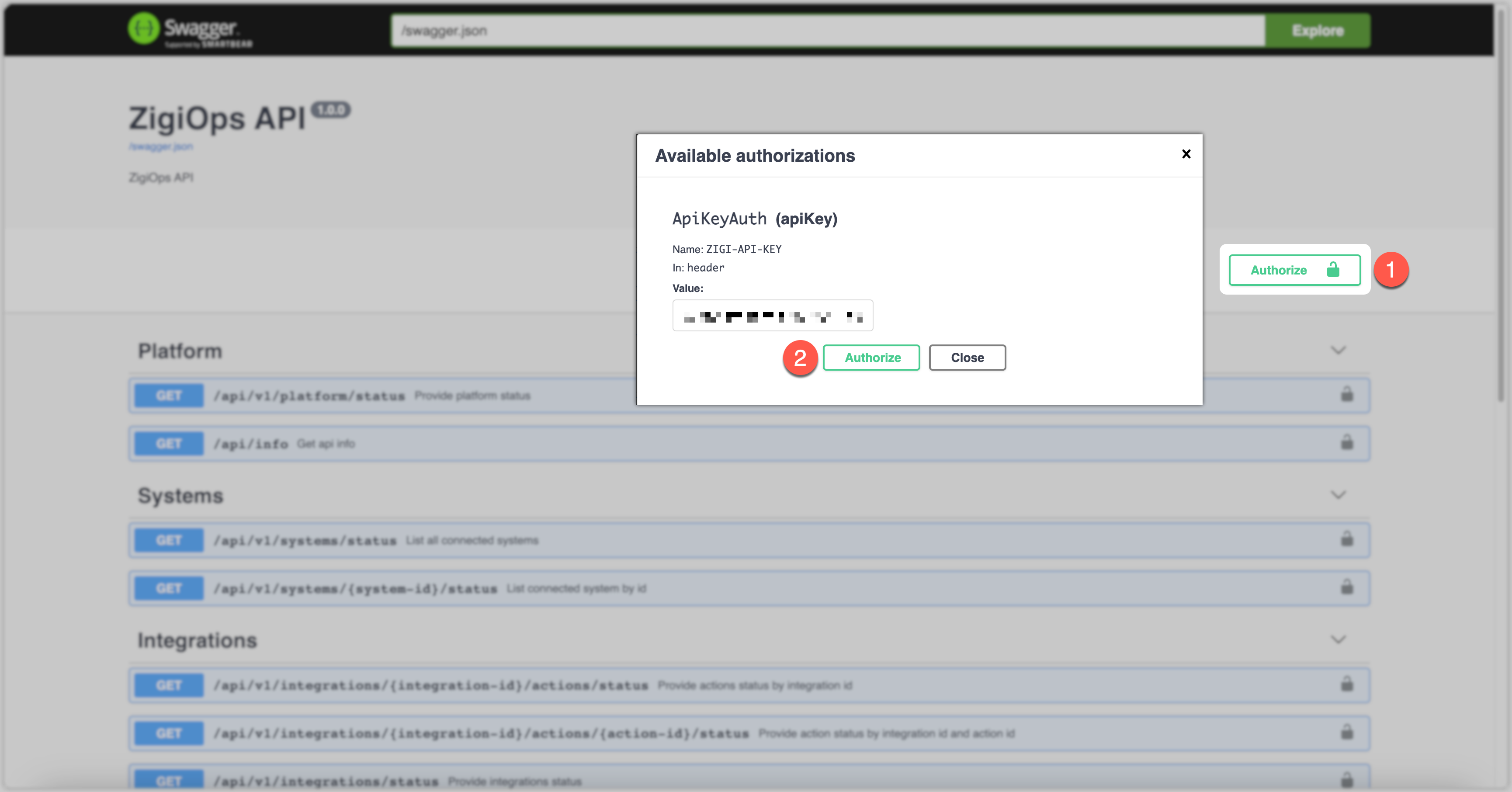 https://zigiops.example.com:8585/swagger/index.htmlendpoint (for on-prem) orhttps://zigiops.example.com/swagger/index.html(for cloud), click the Authorize button, and input your API Personal Access Token.