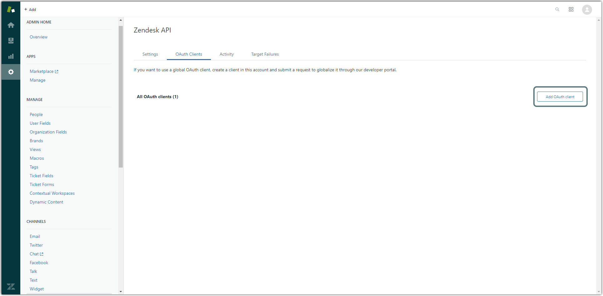 Go to Settings → Channels → API → OAuth Clients and click the Add OAuth Client button to create a client.